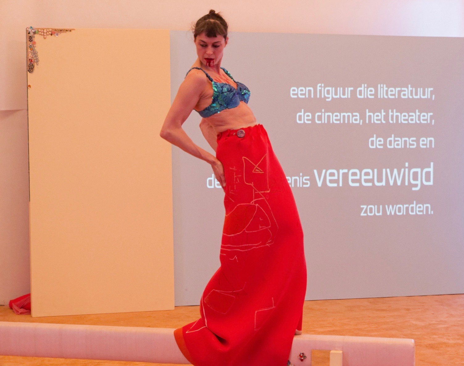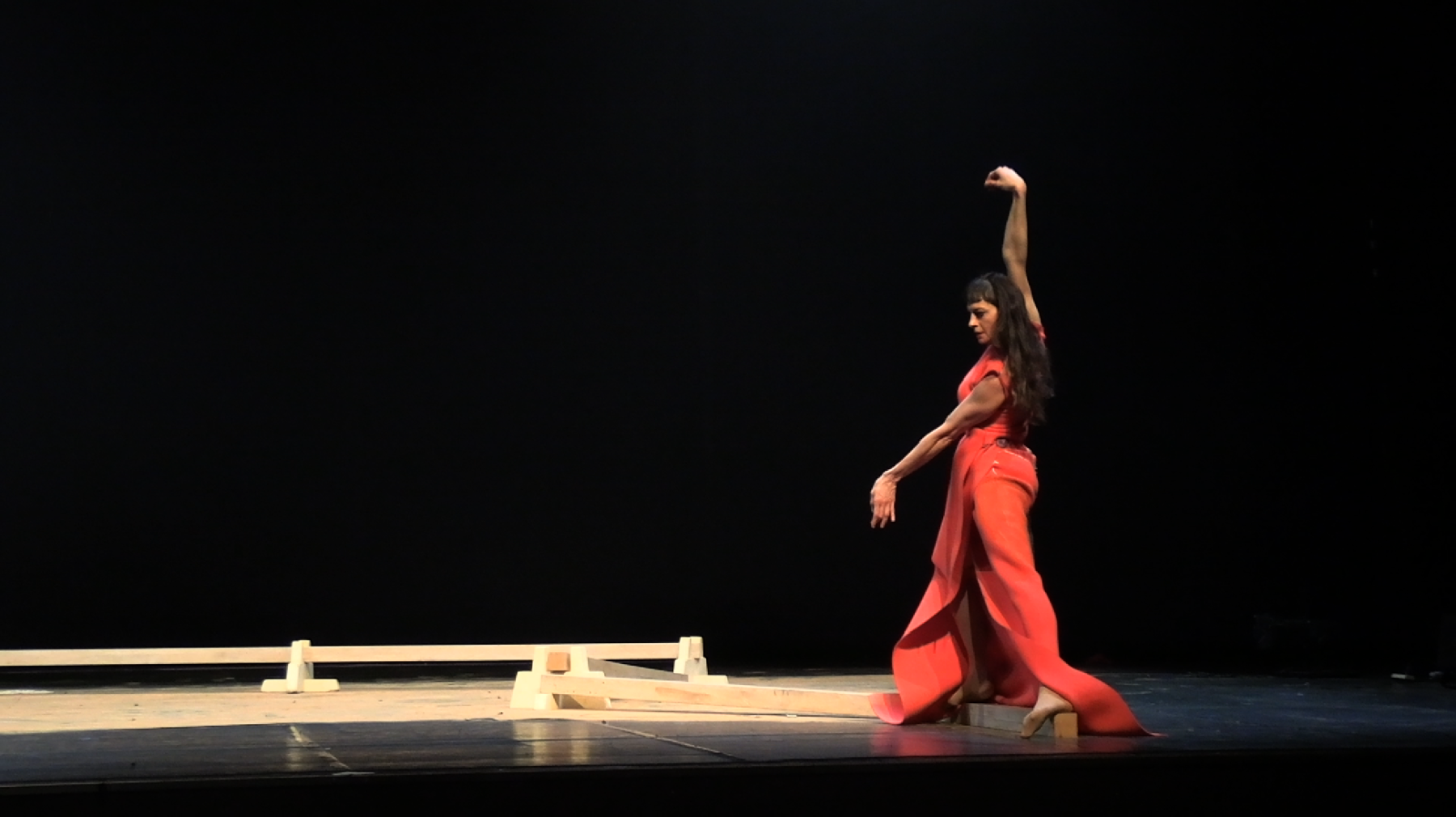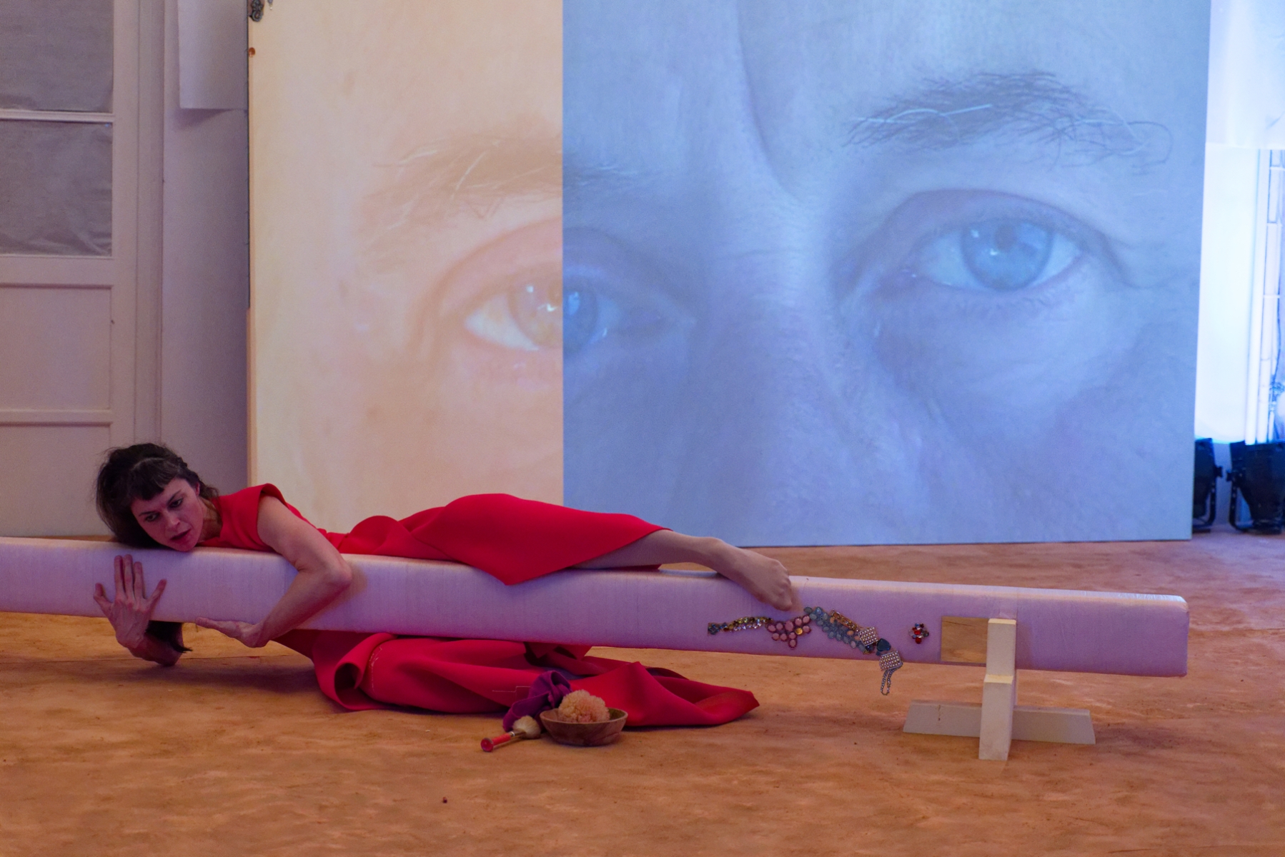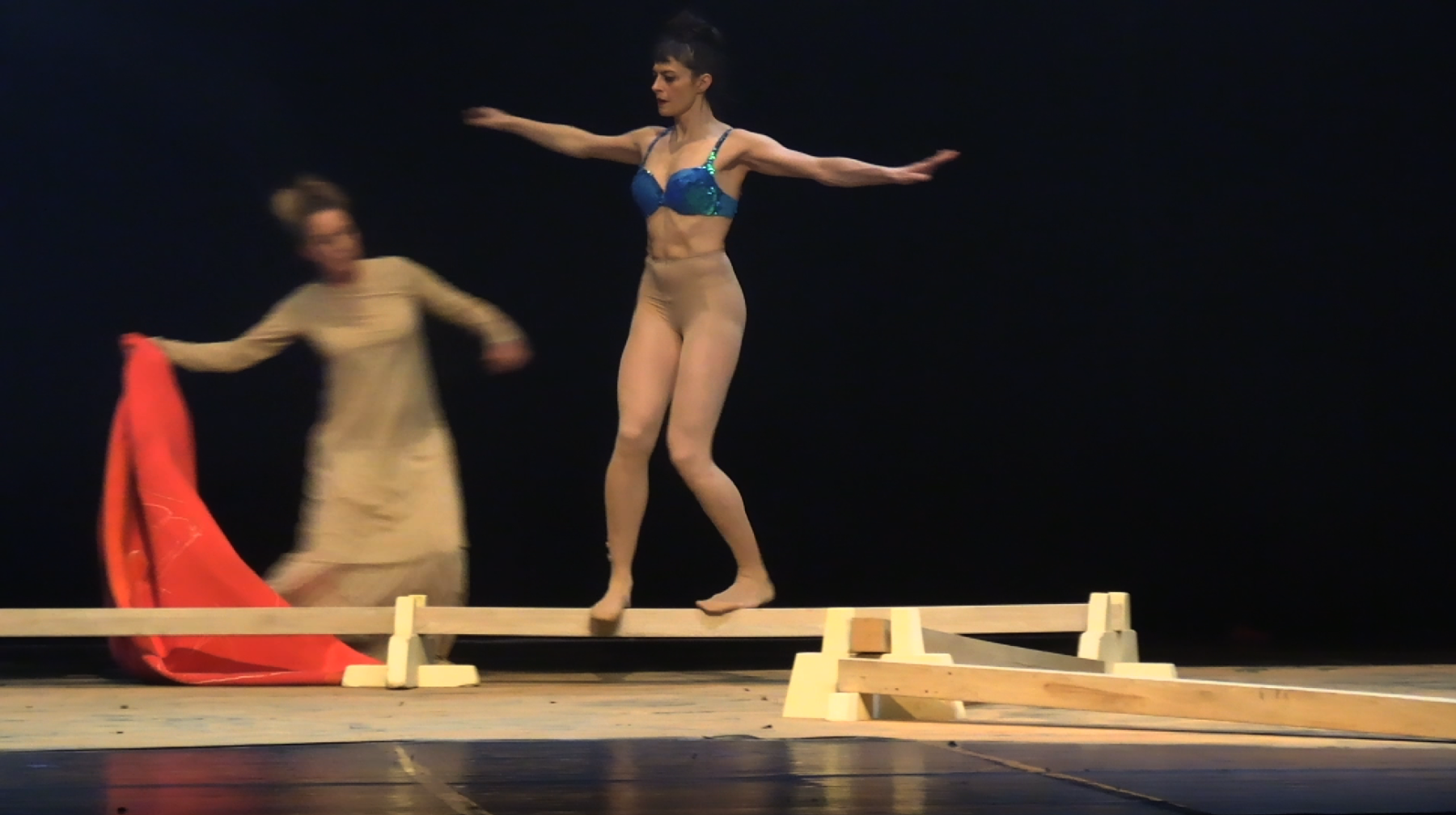 In a unique scenography, Italian dancer Angela Babuin embodies Mata Hari, flanked by Pé Vermeersch, who sings and dances her soul. A long balance beam functions both as a metaphor for the timeline leading toward Mata Hari’s futile execution and as a fragile, limiting, and challenging space for movement. The relationship between costume and nudity is a central element of the work, developed in collaboration with costume designer Anita Evenepoel. The presence of the man is addressed not in a dominant way, but through a soft, ongoing male gaze projected onto a large screen and through readings by French actor Marc Lesage.