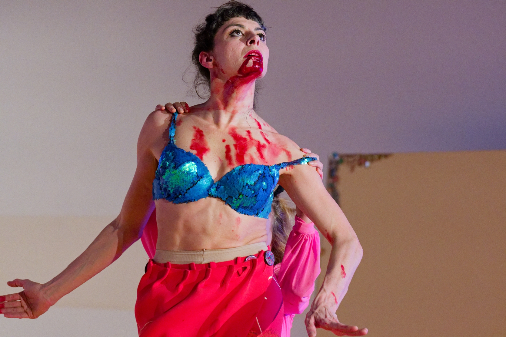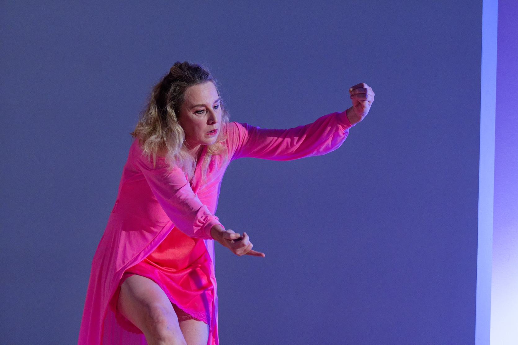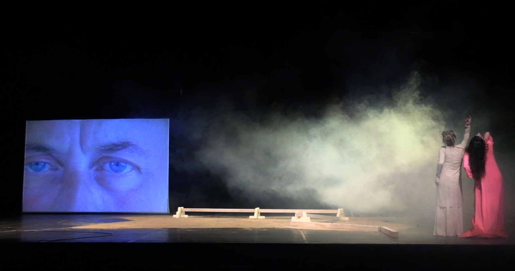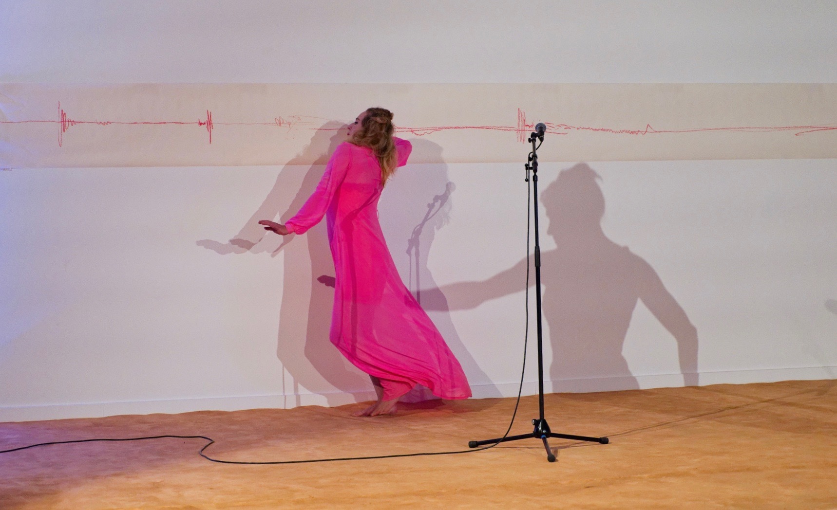 In a unique scenography, Italian dancer Angela Babuin embodies Mata Hari, flanked by Pé Vermeersch, who sings and dances her soul. A long balance beam functions both as a metaphor for the timeline leading toward Mata Hari’s futile execution and as a fragile, limiting, and challenging space for movement. The relationship between costume and nudity is a central element of the work, developed in collaboration with costume designer Anita Evenepoel. The presence of the man is addressed not in a dominant way, but through a soft, ongoing male gaze projected onto a large screen and through readings by French actor Marc Lesage.